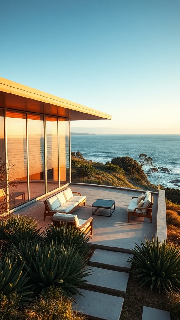A highly detailed exterior photograph capturing a mid-century modern style house with sweeping ocean views at eye level, bathed in soft daylight and featuring indirect lighting. The architecture is reminiscent of designs by Frank Lloyd Wright, Charles and Ray Eames, and Mies van der Rohe, with sleek lines and expansive glass panels that blur the line between indoor and outdoor living. The house is complemented by a carefully landscaped garden with native coastal plants, enhancing its integration with the natural surroundings, while stylishly understated mid-century furniture invites relaxation on a spacious ocean-facing patio.