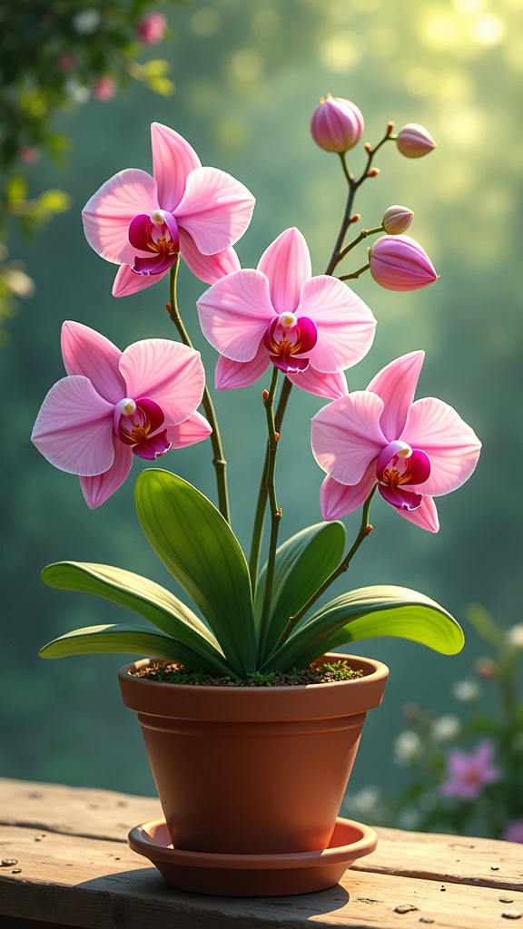 A beautifully detailed painting captures a flower pot adorned with vibrant orchids, set in a serene outdoor scene. The composition follows the rule of thirds, creating a cinematic feel and showcasing the orchids in full bloom. The artwork, rendered with absurdly high resolution, embodies a masterpiece in the style of Studio Ghibli. The whimsical yet serene quality of the scene evokes a sense of fantasy and tranquility, reminiscent of a painting by a visionary artist with a unique perspective. The interplay of light and shadow adds depth and warmth, enhancing the overall enchanting atmosphere.