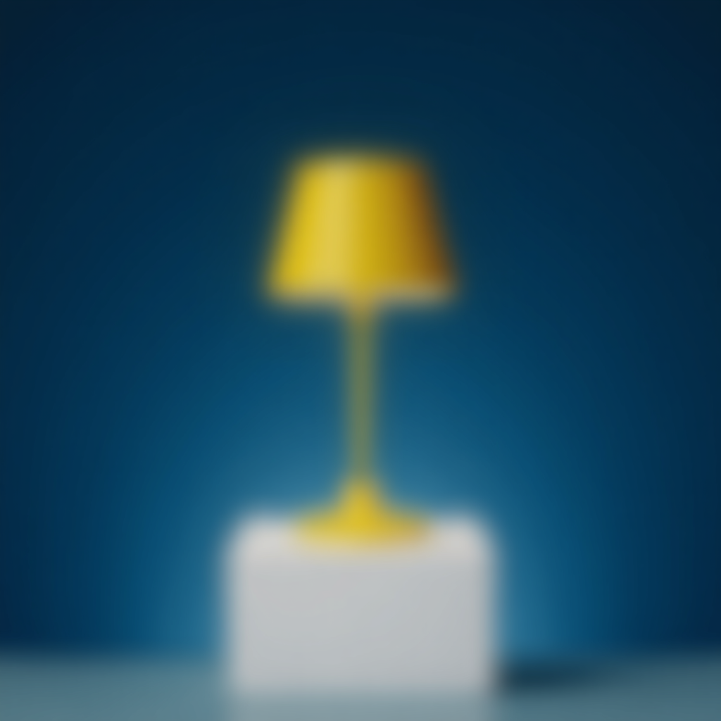 View this AI-generated image featuring a highly detailed photorealistic image captures the front view of a sleek louis poulsen panthella 250 table lamp finished in a vibrant yellow with a reflective surface the lamp is positioned on a 45 degree white square box within a professional photo studio set