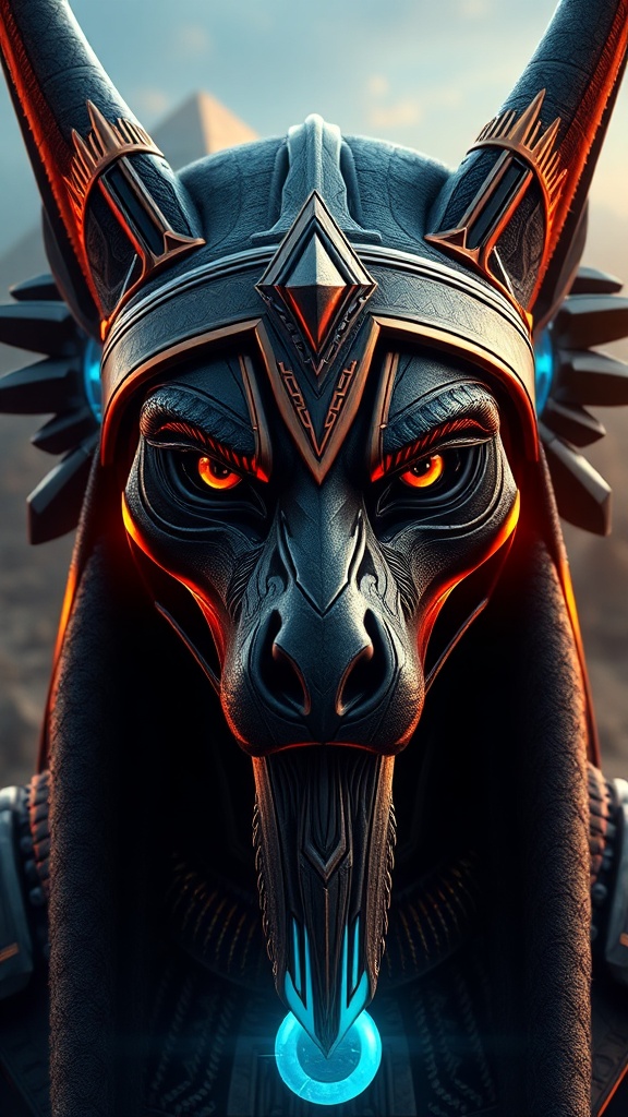 View this AI-generated image featuring a hyperrealistic and intricately detailed portrait of an egyptian male anubis with cyberpunk influences set against a backdrop of pyramids the artwork captures his black hyperdetailed eyes conveying a dark fantasy vibe rendered as an epic masterwork the piece f