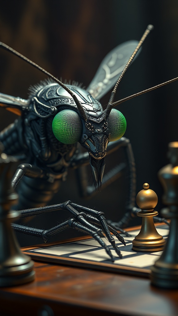 A meticulously detailed portrait of a mosquito with big green eyes sitting at a table engrossed in a chess game; its body adorned in intricate armor that glimmers under a cinematic light, giving a sense of epic intensity and focus; the scene is rich in detail, capturing the tension and strategy of the match.