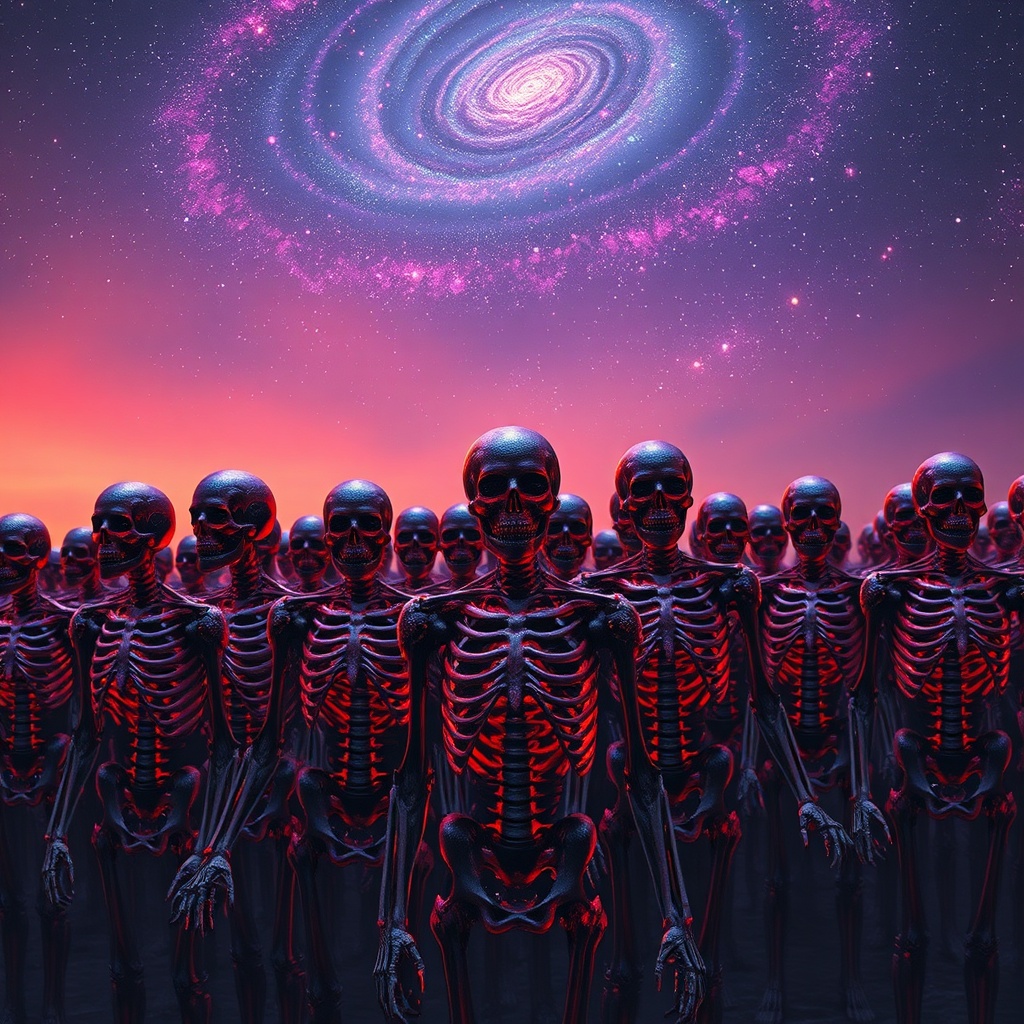 A legion of intricately detailed skeleton warriors stands amidst a celestial twilight, their bones shimmering in hues of dark purple and crimson. The somber yet majestic ambiance is reminiscent of Magali Villeneuve's ethereal artistry, where each figure exudes a haunting elegance. In the sky above, celestialpunk elements blend seamlessly, with distant galaxies swirling in a vivid tapestry of stars. The scene captures a dark and brooding intensity, reminiscent of a Zacharias Martin Aagaard masterpiece, with hyper-realistic textures bringing each bone and armor plate to life, creating a mesmerizing fusion of the fantastical and the cosmic.