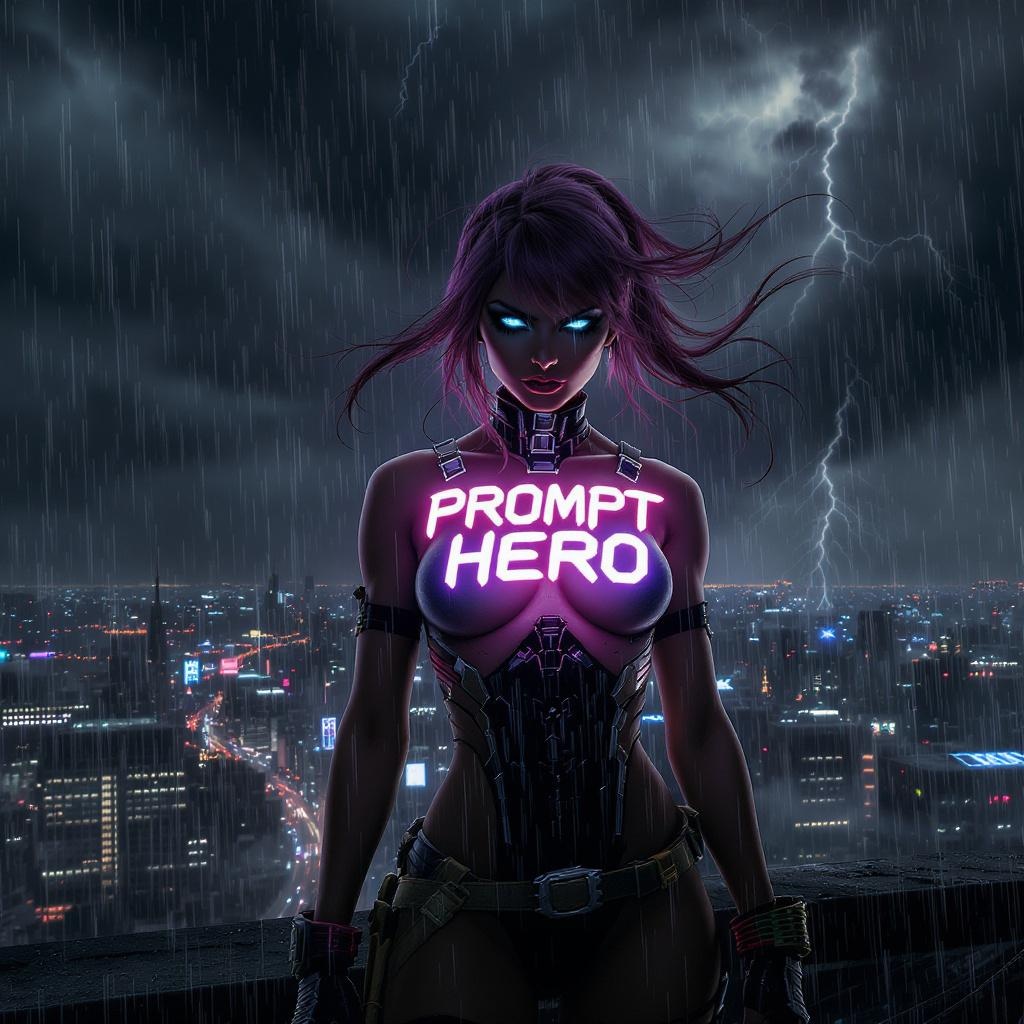 Digital artwork concept art featuring a cyberpunk girl with "Prompt Hero" emblazoned across her chest, standing on a rooftop overlooking a sprawling dark dystopian city. Her dynamic pose exudes fierceness, capturing the essence of a comic book style, with meticulous intricate detail and ominous lighting accentuating the scene. Dramatic lighting bathes her in contrast against the backdrop of a dark, stormy night. The image is reminiscent of a Hasselblad shot with a long exposure, adding depth and intensity to the atmospheric setting, with subtle creative modifications enhancing her presence amidst the urban chaos.