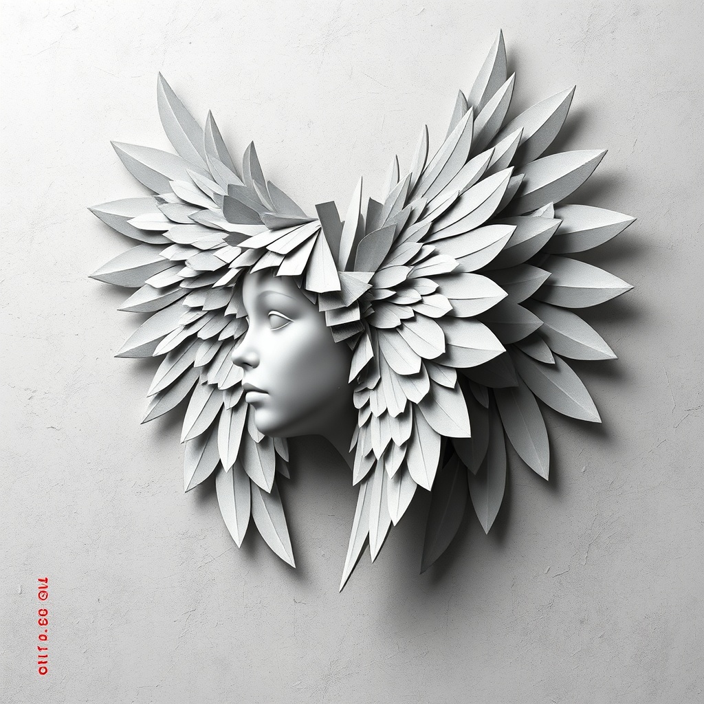 A surreal digital illustration featuring the head of an angel with ethereal, intricately layered wings crafted from a collage of paper fragments in various shades of grey. The background boasts a textured surface, imparting a sense of depth and complexity to the composition. The artwork employs soft edges, with gentle lighting effects enhancing the sense of depth and mystery. Minor creative adjustments accentuate the abstract nature of the piece, maintaining the core essence of the original vision.