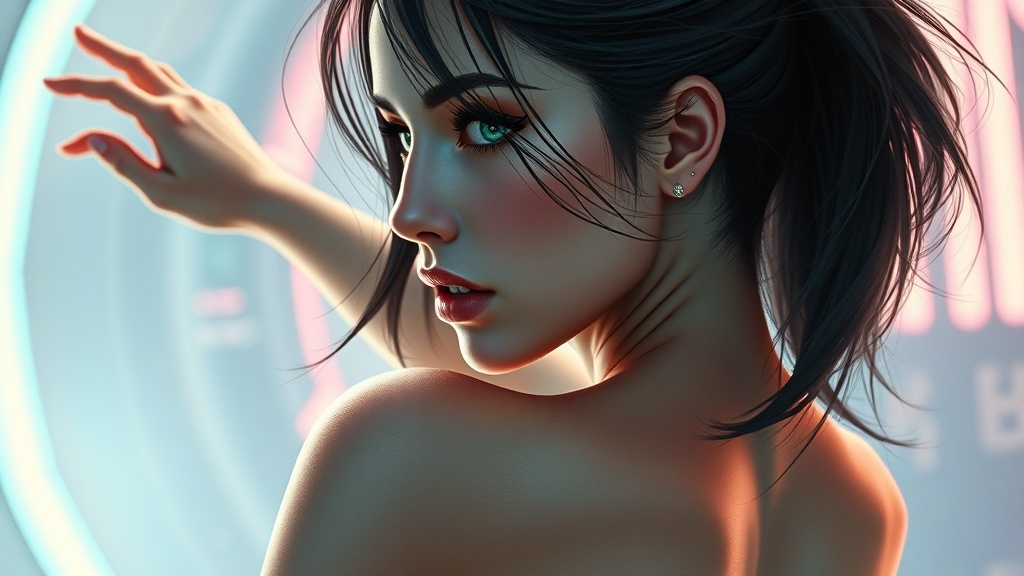 Digital illustration of a stunning neofuturistic woman, depicted from the waist up, with her back partially exposed, featuring mesmerising heterochromia with one eye a vibrant blue and the other a striking green. Styled in the signature artistry of Julia Razumova and Ilya Kuvshinov, she strikes a dynamic pose in mid-action, her movements fluid and captivating. The scene is suffused with soft pastel hues, casting a dreamlike quality over the composition, while interspersed light flares add a dramatic flair. Set against an imaginative and sleek futuristic backdrop, the artwork exudes realism, rendered in ultra-high detail, achieving the status of a true masterpiece, capturing every nuance and intricacy in 8K resolution.