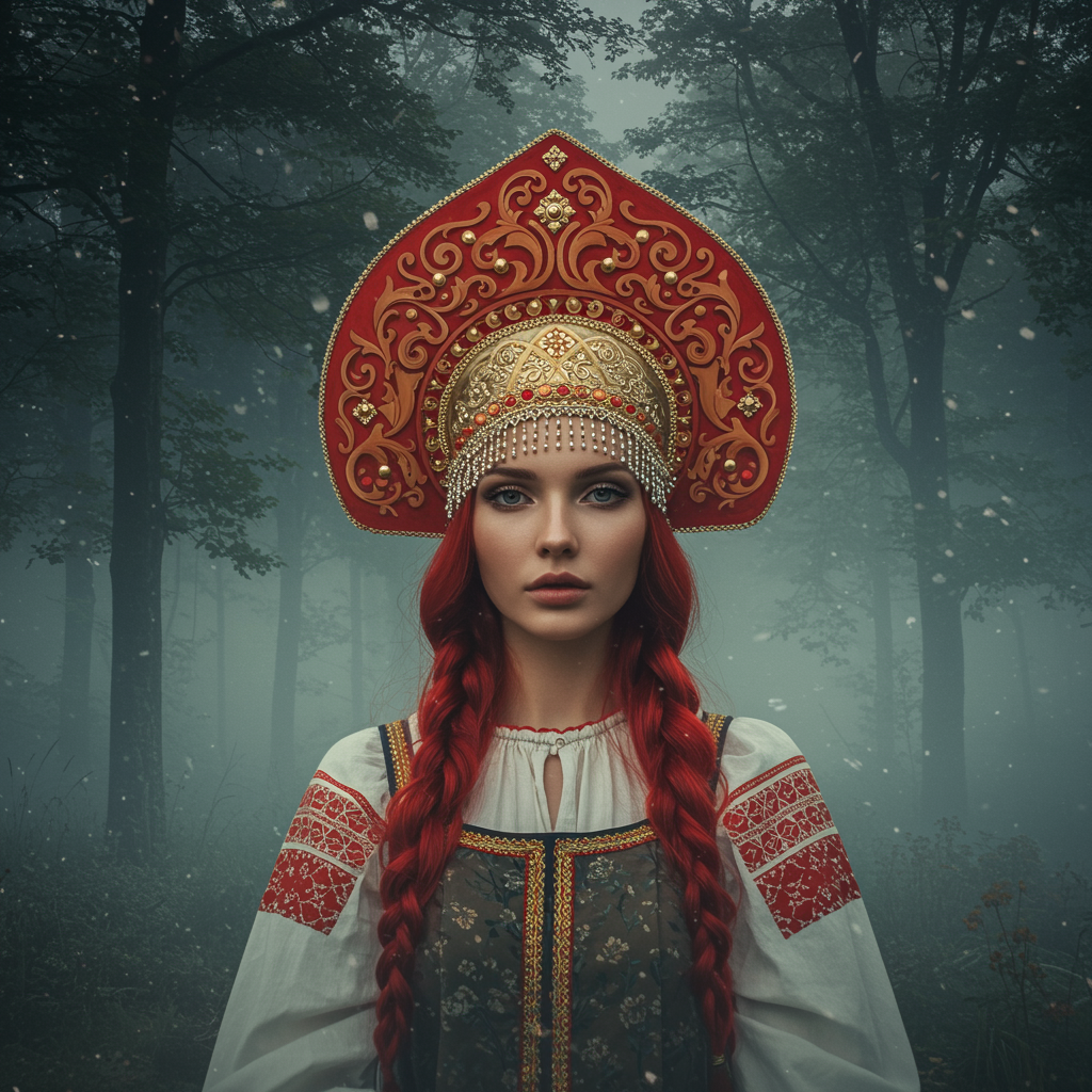 A stunning digital painting showcasing a misty forest under the brilliance of a starry night, focusing on a girl with an intricately carved red kokoshnik adorned with exquisite golden ornaments. She wears an elegant Russian folk dress, her appearance capturing the essence of realism and perfect anatomy, inspired by the styles of Artgerm, Greg Rutkowski, and Alphonse Mucha. The artwork features hyper-realistic details and an epic cinematic quality reminiscent of octane render techniques. The forest's ethereal beauty is enhanced through high-detail post-processing and subtle creative modifications, resulting in a breathtaking and immersive visual experience.
