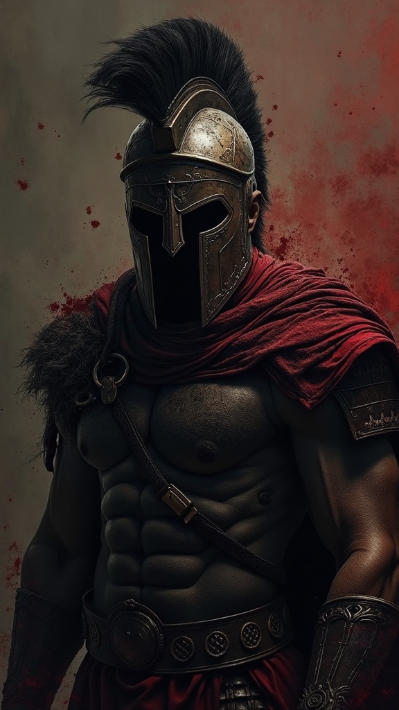 Digital wallpaper portrait of a Spartan warrior with a concealed face set against a somber background, exuding a brutal and majestic presence. The style is dramatic, capturing the essence of expressionism and conveying profound emotion. The work is a close-up, unforgettable in its execution, showcasing high-quality digital painting techniques like splatter and drip. The atmosphere is hauntingly powerful. The artwork avoids imperfections such as jpeg artifacts or poor quality issues, and focuses on an impactful, cohesive portrayal of strength and mystery without unnecessary details or distortions.