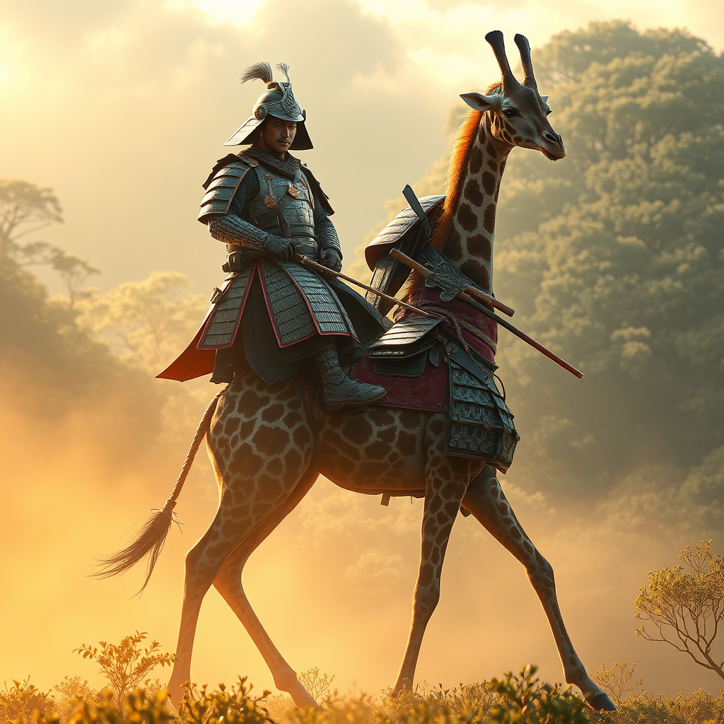 A vibrant DNA-inspired artwork depicting a samurai clad in traditional armor, astride a majestic giraffe. The scene captures a unique blend of cultures, merging the intricate details of Japanese armor with the wild elegance of the giraffe. The samurai's expression is a mix of serenity and determination, set against a dreamlike landscape that evokes Marcin Sobas's emotional depth. The overall imagery resonates with the photorealistic detail found in Dmitri Danish's style, yet adds a slight surreal twist, as the giraffe strides through a lush, misty forest bathed in golden light. The fusion of natural elements with the structured elegance of DNA art creates a captivating and emotional visual story.