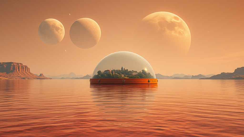 A lone dome-shaped object floats serenely in the water, painted in the style of science fiction art. Its tonalist color scheme features light oranges and crimsons, suffused with natural light. The scene is captured through the perspective of a Samyang AF 14mm f/2.8 RF lens, presenting a romantic desertpunk landscape. The hyper-realistic details are rendered in 32k UHD, embodying a masterpiece of digital art and fantasy. In the background, a green city sits gracefully amidst eroded interiors, with hues of light red and orange, set against an exotic Australian landscape. Beneath this celestial panorama, multiple planets hover in a mesmerizing dance. The image, taken with a Nikon D750, showcases transfixing marine scenes, enveloped in natural light, transforming the vision into a hyper-detailed, realistic rendering, forming a wonder of digital art and fantasy.
