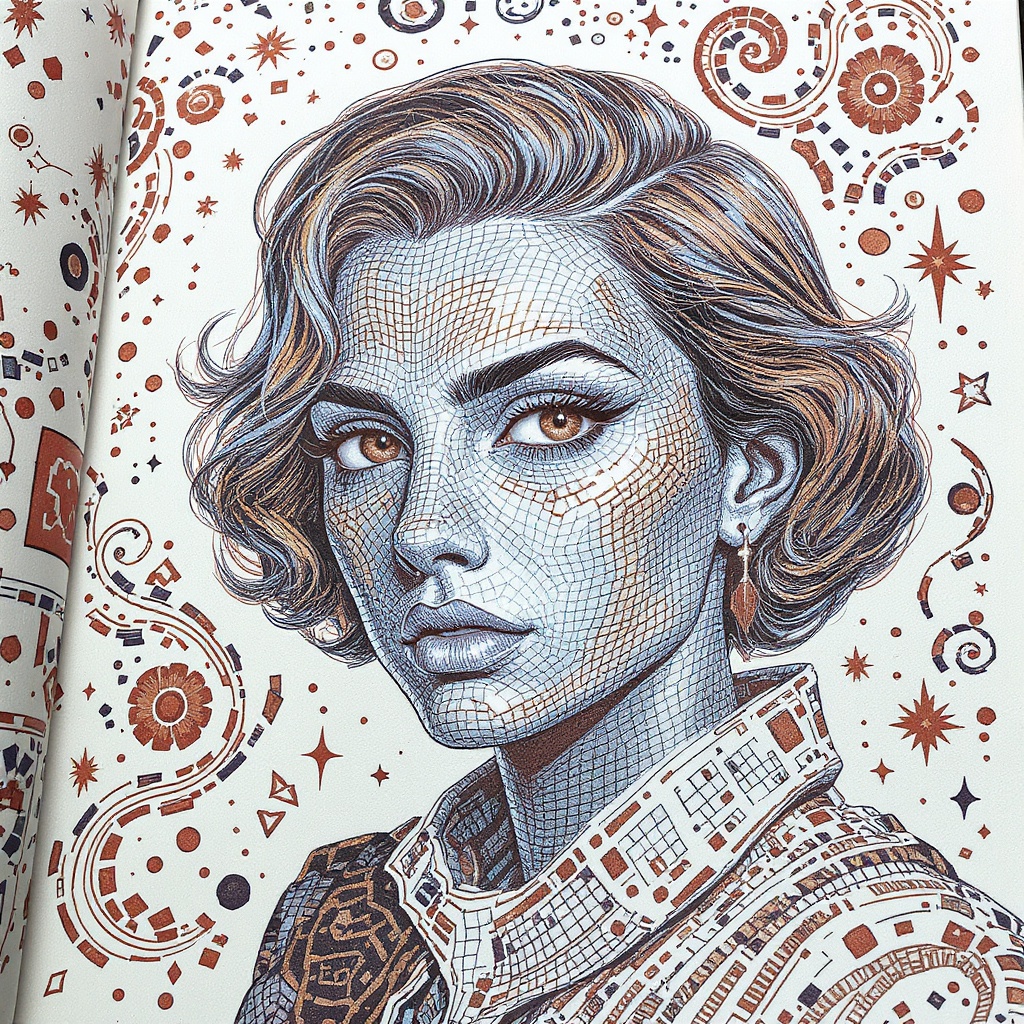 View this AI-generated image featuring doodle art 3d featuring pop art inspired portraiture with intricate interference patterns blending light sky blue and bronze hues rendered in hyper realistic detail with engraved line work reminiscent of graphic novels art captures dynamic storytelling with aug