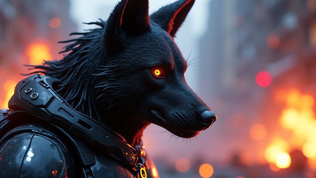 View this AI-generated image featuring dreamlikeart 3d render of a futuristic military cyborg wolf in a cyberpunk setting equipped with warframe inspired stealth armor illuminated by neon lights and set against the backdrop of an explosive scene character design features hard surfaces and smooth hig