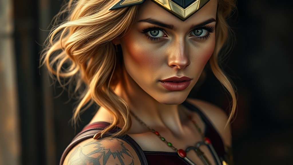 View this AI-generated image featuring a female dressed as captain marvel in metal lingerie with tattoos gazing at the viewer in a photograph the portrait showcases detailed realistic skin with a photo realistic approach in 8k resolution the image is highly detailed in a full length frame captured i