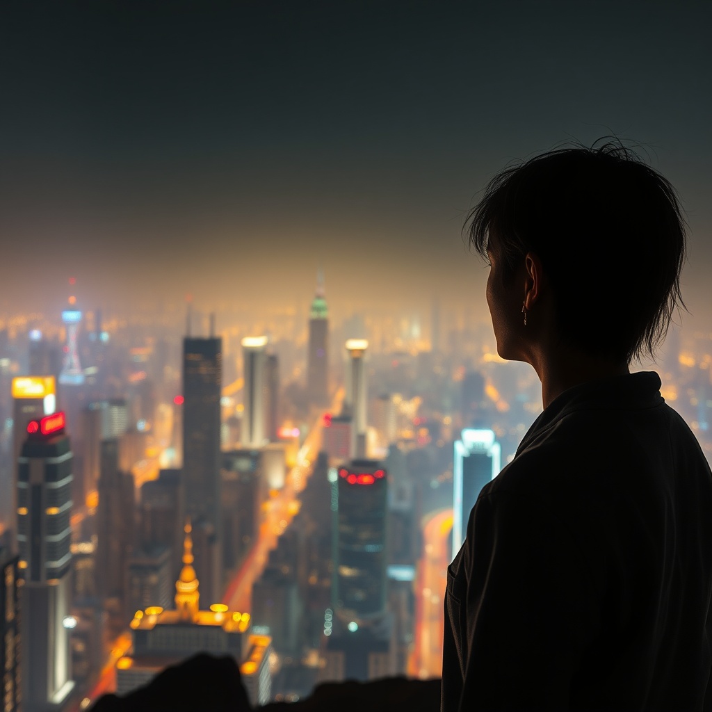 Dystopian cityscape with high detail and rich RAW colors, a figure stands on an overlook gazing at an expansive cyberpunk skyline, face flawlessly crafted, enhanced by raytracing and specular lighting. The scene, captured with a shallow depth of field and a 200mm lens, showcases a smooth, cinematic film quality. Rendered in CGI with an emphasis on realism, the city glows in the night. Despite the city's beauty, an undercurrent of imperfection runs through, with elements slightly out of alignment—shadows not quite matching their objects and light sources that flicker unpredictably. The skyline is a digital masterpiece that hints at a world of advancements mixed with subtle dystopian chaos.