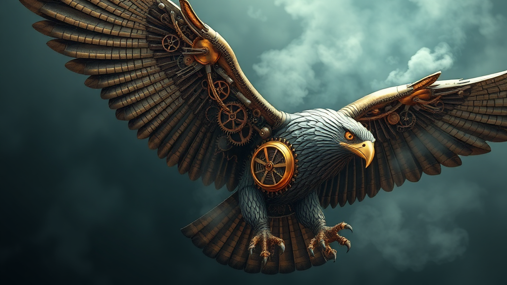 A majestic eagle adorned with intricate brass and copper gears, its wings a tapestry of mechanical feathers that whir and click with every powerful flap. The gleaming, metallic body is accentuated with ornate clockwork patterns, its eyes glowing with a warm amber light, scanning the world below with precision. Steam billows gently from its joints, as it soars through the air with a blend of grace and industrial prowess, a symbol of innovation and nature unified.