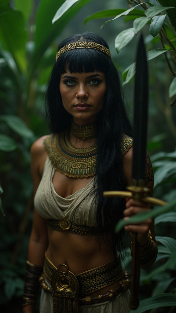 An adult Egyptian woman with captivating green eyes and sleek black hair adorned with traditional flaps, her face expertly made up, stands confidently in an ancient Egyptian-themed setting. She embodies a feral jungle warrior, wielding an obsidian stone knife, surrounded by dense bushes and poisonous plants. The atmosphere is thick with humidity, evoking a sense of darkness and mystery within a dimly lit chamber. The scene is cinematic, reminiscent of a 1970s film, rich with high-frequency details captured on 35mm film, adding a layer of authenticity with subtle film noise. A masterpiece of visual storytelling, it captures the essence of both antiquity and the wild, blending them seamlessly into a detailed vision of an intrepid adventurer.