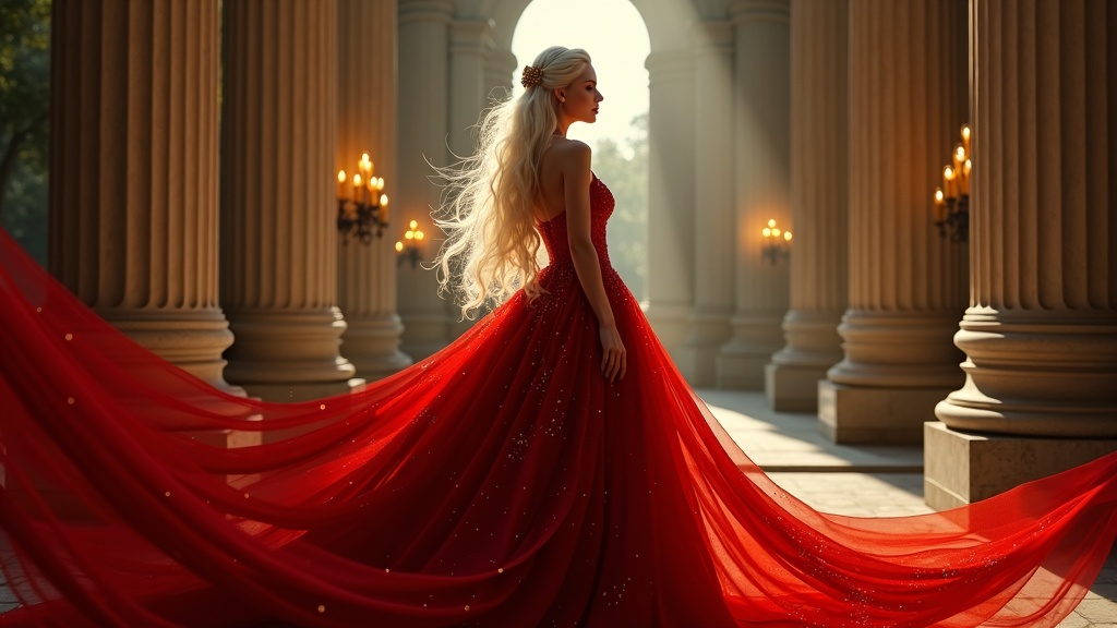 Elegance personified, a gorgeous queen exuding majesty and allure, casts an emotional and intense spell with a passionate grace. Her eyes, striking in their yellow glow, complement her long, sparkling white hair. She is adorned in a very long, intricately flowing red dress, reminiscent of a Roman goddess, set against a backdrop of neoclassical architecture. Moonbeams illuminate the scene, with star-like lights adding to the epic composition. The portrait, a stunning full-body depiction, is captured with intricate surface detail and ethereal lighting. Rendered in contemporary realism, this 8k hyperrealistic image features sharp focus and deep clarity, offering a sense of ultra-quality that's both complex and breathtaking, worthy of award-winning art standards.