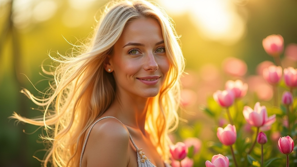 The essence of springtime embodied, a vibrant figure symbolizing renewal and growth. Surrounding them are blooming flowers and lush greenery, their presence bringing warmth and light. Gentle breezes play with their hair, a cascade of vibrant colors reflecting the season's rebirth. Their eyes sparkle like dew-kissed petals in the morning sun, exuding the vitality and promise of life returning after the thaw. Subtle hints of pastels in their attire evoke a sense of rejuvenation, as new beginnings blossom in every corner of the scene, capturing the spirit of spring in its full glory.