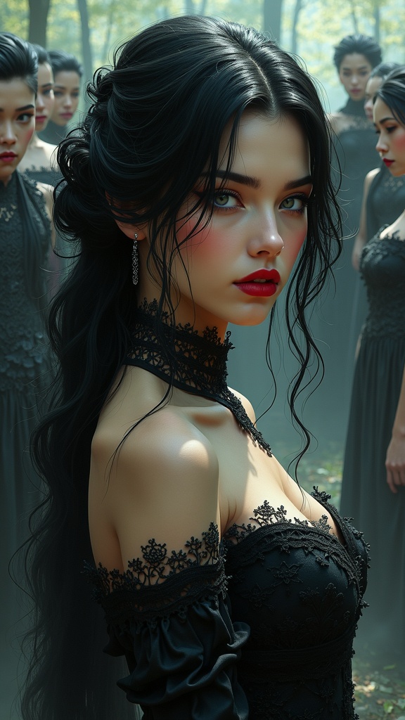 Enchanting queen with raven-black hair, regal elegance reminiscent of Game of Thrones, captivating allure with bold red lipstick, set in a fantasy world with intricate and highly detailed digital painting style, inspired by the works of Artgerm, Greg Rutkowski, and Alphonse Mucha. Sharp focus illustration on Artstation, capturing a mystical atmosphere, where her beauty contrasts with surreal elements like additional arms and ethereal multi-limbed forms, amidst a gathering of enigmatic figures, portraying an otherworldly assembly in 8k resolution.