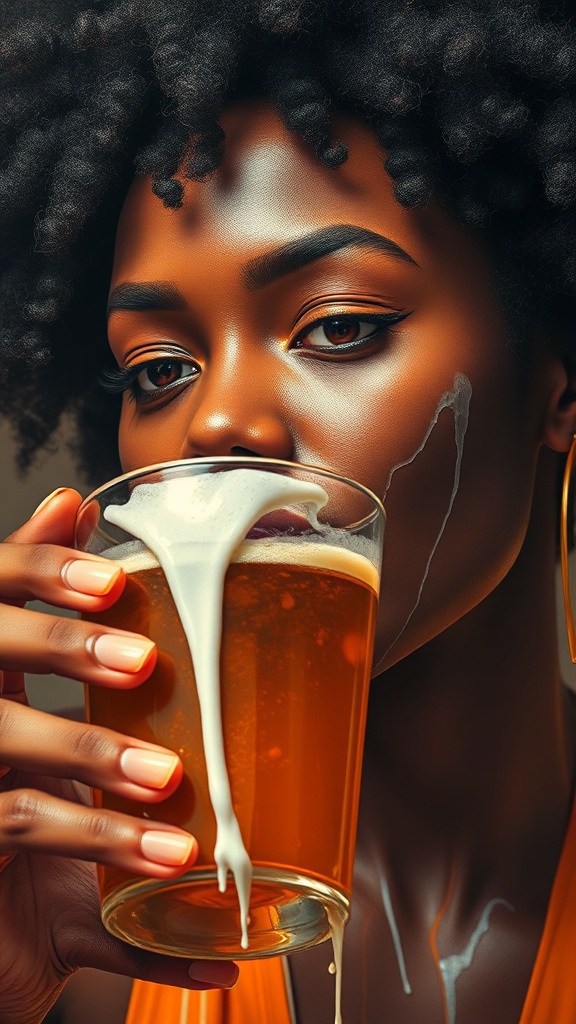 "Enjoy your brew capture three, rendered with a surreal illustrative flair, vibrant pop colors, infused with deep amber and stark white hues, employing a paint dripping effect. Inspired by Afrofuturism, blending realistic portraiture elements with fluid motions, burst of hues --aspect ratio 8:11 --style 750."