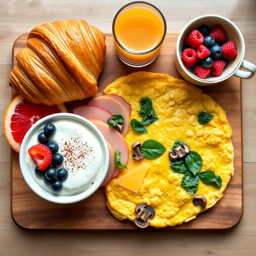 A visually enticing breakfast spread featuring a freshly baked almond croissant, a fluffy spinach and mushroom omelet, thinly sliced turkey ham, and aged cheddar cheese, served alongside a bowl of creamy vanilla yogurt topped with fresh berries. A glass of freshly squeezed grapefruit juice and a cappuccino with delicate latte art round out the meal, all elegantly arranged on a rustic wooden board.