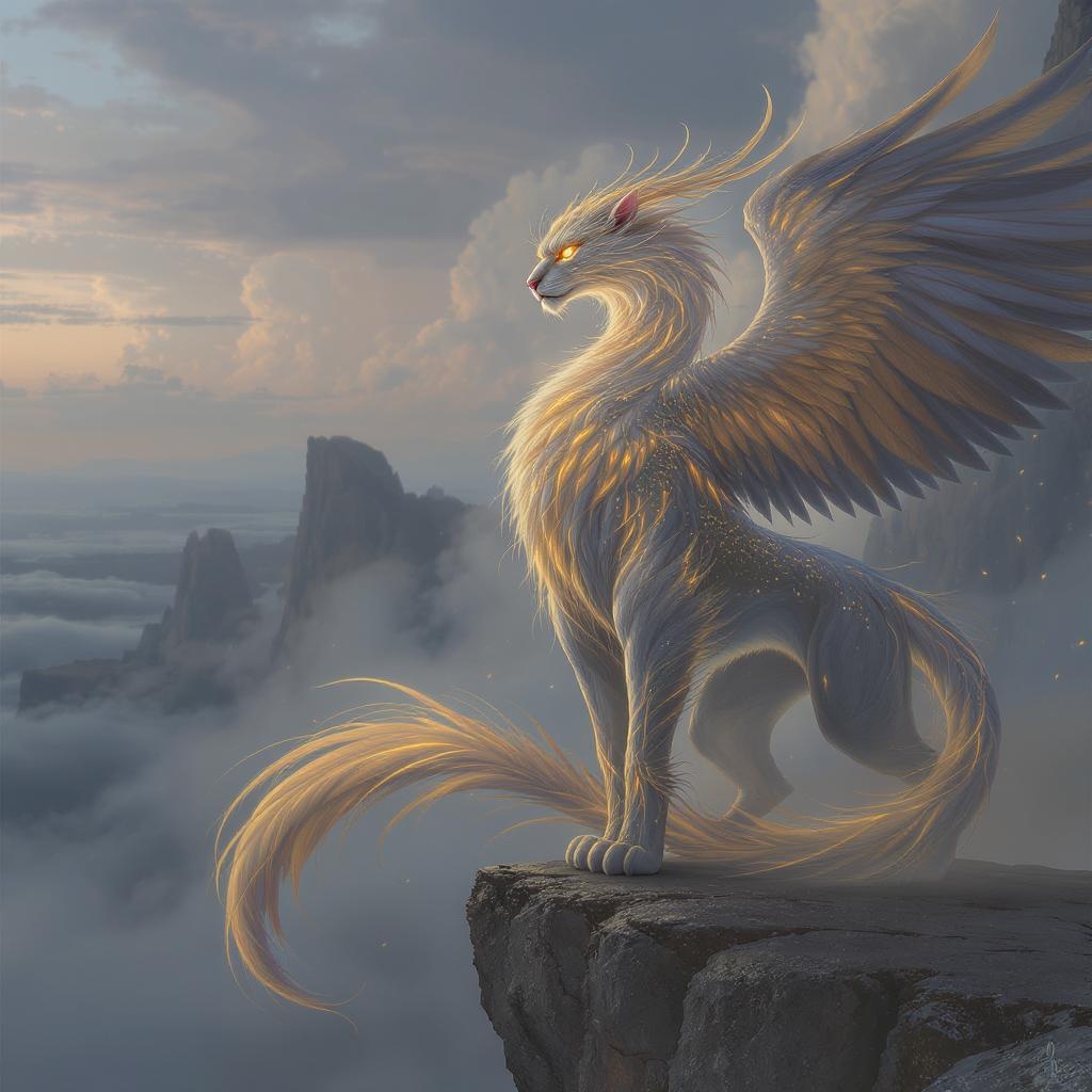 A majestic entity possessing the intuition and wisdom of a sage-like human, the agility and gracefulness of a panther, and the ethereal charm of a mythical phoenix, adorned with luminescent feathers that shimmer in hues of sunrise gold and twilight blue, its eyes glowing with an ancient knowledge that calms storms and stirs the winds of creativity and wonder.