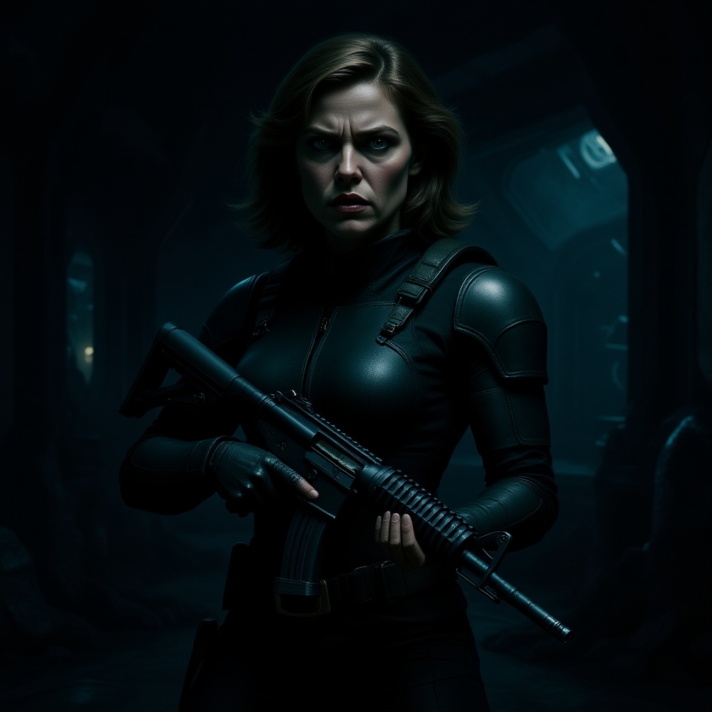 View this AI-generated image featuring epic cinematic 8k wallpaper featuring ellen ripley from the alien movie poised in an intense action stance her determined gaze piercing through the shadows a futuristic weapon gripped firmly in her hands set against a backdrop of a dimly lit eerie spaceship int