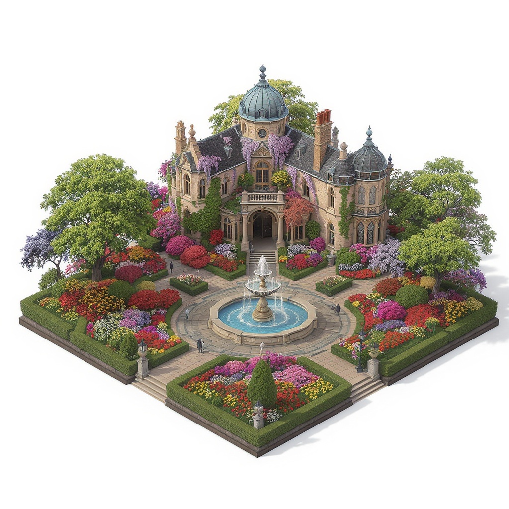 Exquisite masterpiece showcasing an old manor with an enchanting garden, featuring a stunning central fountain. The garden is vibrant, filled with an array of colorful flowers and encircled by majestic trees. Crafted in isometric 3D with octane rendering and enhanced by ray tracing for exceptional detail.