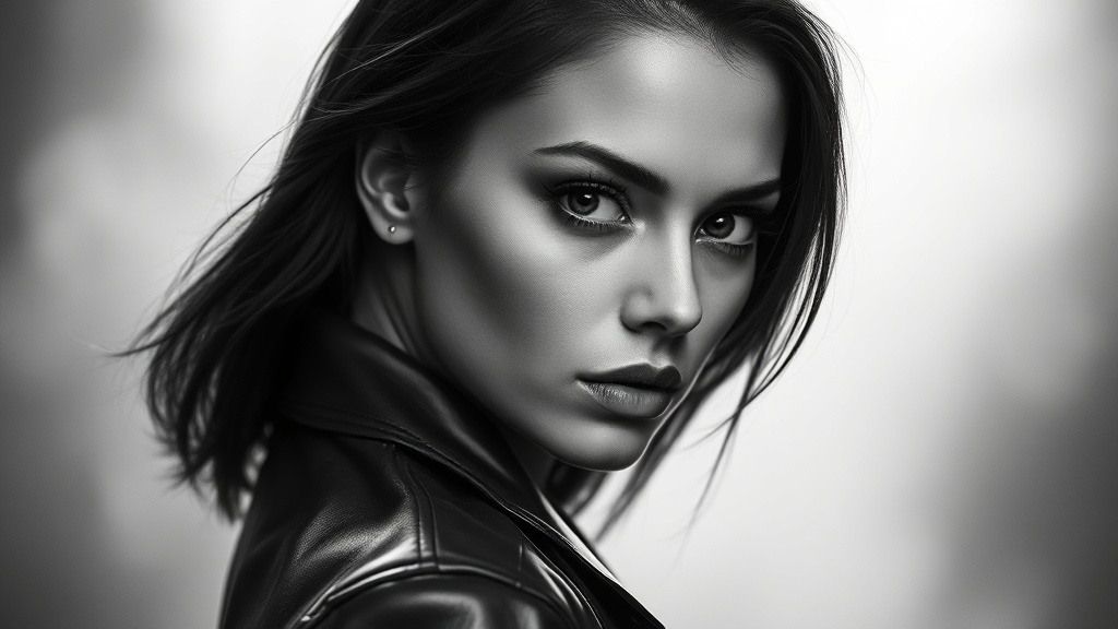 Exquisite quality, 4k resolution, ultra-high detail, masterful creation, lifelike depiction, intricately detailed photograph, cutting-edge fashion editorial in monochrome, alluring woman with dark hair, stunning figure clad in a sleek leather jacket, eyes gleaming with depth, captured in a studio setting, striking silhouette, soft-focus atmospheric backdrop, commanding presence, flawless proportions, premium quality, highly realistic imagery, expert photography, cinematic perspective, dynamic composition, luminous backlight.