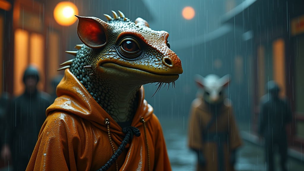 View this AI-generated image featuring exquisitely detailed anthropomorphic targarian adorned in shimmering robes captured with remarkable realism and intricate details set amidst a rain soaked ambiance the scene boasts breathtaking composition and evokes deep emotions under epic cinematic lighting