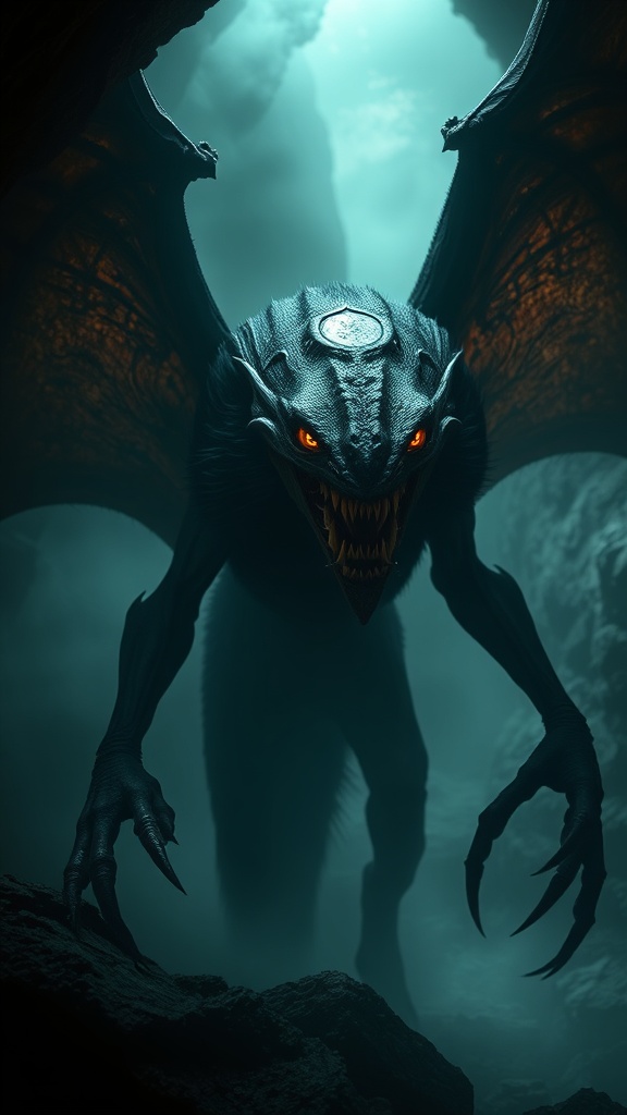 An ominous extraterrestrial entity with leathery bat-like wings, a pitch-black furry torso, and elongated limbs capped with menacing claws, a grotesque visage featuring a predator's maw lined with needle-like fangs, emerging ominously from a shadowy mist-laden cavern. Its lethal, glowing orange eyes pierce the darkness. The scene captures a sense of spine-chilling dread, marked by a dark and elaborate design, filled with intricate detail. The dramatic interplay of light and shadow enhances the photorealistic, cinematic atmosphere, evoking a profound sense of horror. The scene is rendered with cinematic grain and in stunning 8k resolution, emphasizing the foreboding presence within the portrait orientation.