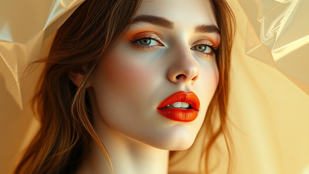 The model exudes an aura of monochromatic serenity, their lips adorned with a vibrant orange lipstick, complemented by matching mascara. The scene unfolds with a blend of macro photography and the ethereal style of Marilyn Minter, capturing the subtle interplay of light beige and light amber tones. Wavy resin sheets create a dynamic backdrop, reminiscent of an animated gif. Shot with a Fujifilm X-T4 and a Sony FE 85mm f/1.4 GM lens, the composition showcases a sophisticated juxtaposition of light brown and light amber hues. Through a lens of 32k resolution, every detail is accentuated, evoking the serene yet striking essence of a Yigal Ozeri painting, rendered in a raw, unfiltered style.
