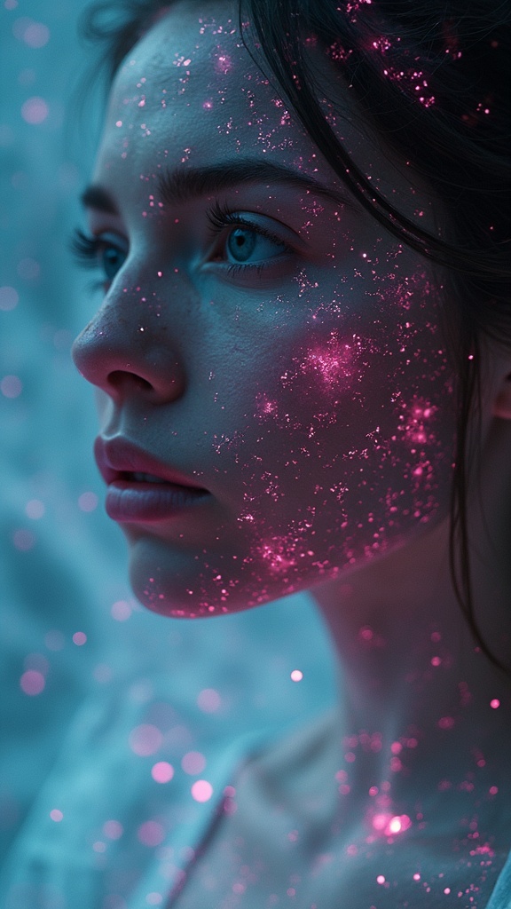 View this AI-generated image featuring a close up of a person s face set against a swirling ethereal backdrop that appears to be both otherworldly and futuristic with hues of ghostly silver and muted teal bright neon pink and iridescent black holographic equations wash over their skin shifting const