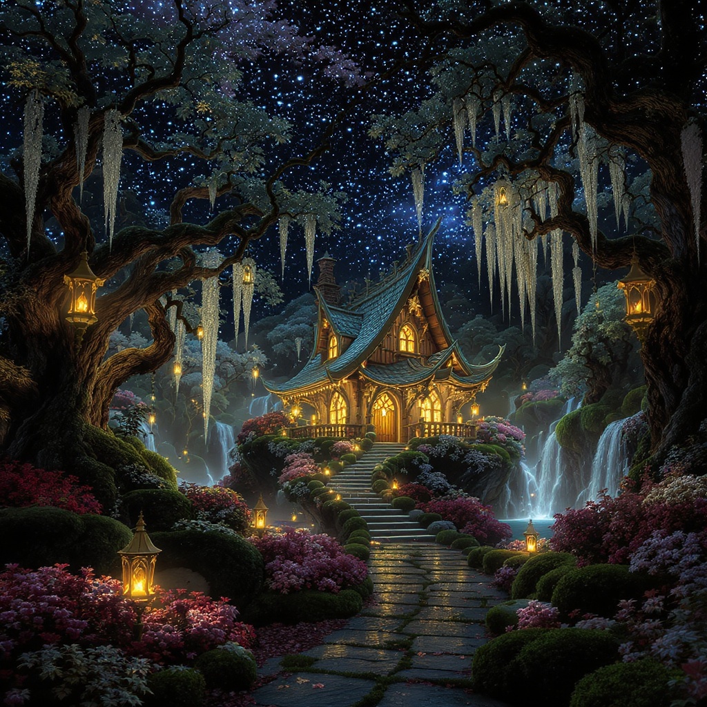 A mesmerizing fairy tale landscape reveals itself under a starlit sky, where nature thrives in enchanting harmony. At the heart of this magical kingdom, a quaint, wooden house stands, radiant with a soft, inviting glow that pierces the surrounding darkness. The scene is bathed in an ethereal bloom, with golden light rays streaming from intricately carved lanterns hanging from ancient trees. Vivid details spring to life, capturing the intricate patterns of moss-covered stone pathways and the delicate foliage that frames the setting. Ambient occlusion enhances the depth and richness of the environment, highlighting every nook and cranny of the symmetrical scene. This cinematic vision, like a raw, photorealistic snapshot, enchants with its incredible beauty—a masterpiece where light meets shadow in a dance of nature and magic.