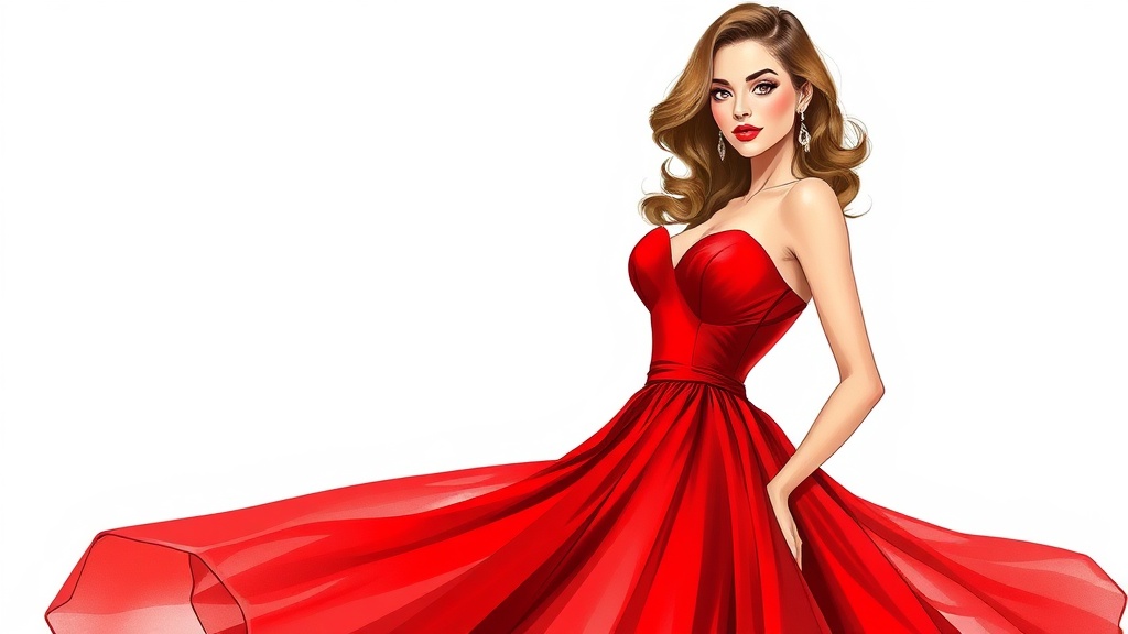 An acclaimed fashion illustration showcases a captivating woman in a stunning crimson dress, its vivid hue drawing all eyes in the room. She exudes elegance and poise, with an air of assured sophistication. Her hair cascades in soft waves around her face, accentuating her features, with a hint of red lipstick in perfect harmony with her attire. The illustration presents her in a full-length pose, emphasizing the dress's intricate details and her self-assured stance.