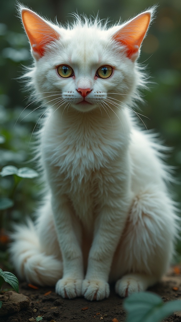 View this AI-generated image featuring a mystical feline sprite with anthropomorphic features embodying the elegance and curiosity of a cat adorned with ethereal shimmering fur and glimmering expressive eyes that reflect the spirit of a playful yet wise creature. Created using advanced AI technology