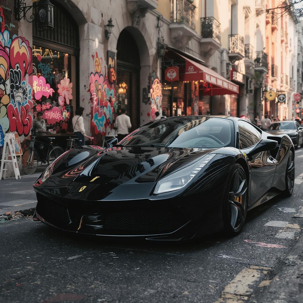 View this AI-generated image featuring ferrari f8 soft ambient light from the side vibrant background filled with colorful street art car positioned slightly off center in the frame bustling city avenue with cyclists and vendors mirror image of the car reflected in a cafe window detailed shot of the