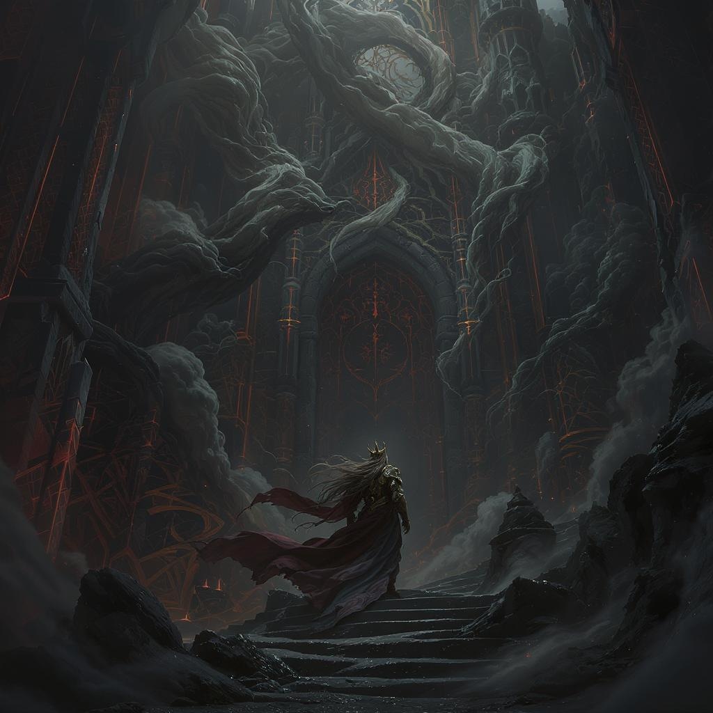 A royal figure stands in the heart of a massive, foreboding castle, their long, windblown hair and intricate cloth swirling dramatically around them. The scene is steeped in a dark, mystical atmosphere reminiscent of Magic the Gathering, with vibrant contrasts highlighting the ominous environment. Clouds of toxic fumes and ghostly smoke spiral around, creating an ethereal aura. The composition, inspired by Massimo Caggese, features dramatic shadows and intricate, orthodox symbolism woven into the design. This ambient, tribal dark fantasy wallpaper is an ultra-detailed 3D rendering, utilizing cutting-edge technology like Unreal Engine and Blender. The scene comes to life with cinematic lighting in 8k resolution, offering a hyper-realistic isometric view that adds depth and emotion to the composition.