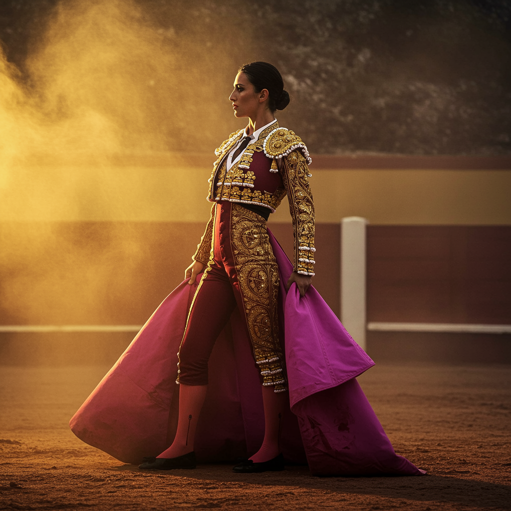 Fine arts oil painting of a stunningly beautiful woman matador captured in a side angle with accent lighting from below, exuding hyperdetailed, hyper-realistic dynamism in a full-body portrait. The intense and raw emotion of the scene is enhanced by rich, cinematic color grading and accentuated by a breathtaking backdrop reminiscent of corrida. Photorealistic, packed with detail, as if shot on a Canon EOS-1D X Mark III with a Fujifilm GFX 100S medium format camera, using a GF 32-64mm f/4 R LM WR lens at 45mm. Captured in the soft morning light with an aperture of f/5.6, ISO 200, and shutter speed of 1/125 sec, the warm sun casts whimsical shadows, bringing depth and enchantment. The setting, reminiscent of James Jean and Jean-Honoré Fragonard, features a golden and pastel yellow powder background, combining the serene beauty of nature with the vibrant, cinematic essence of an idyllic sunrise. Epic, intricate, and celebrating the elegance of a matador in a symphony of light, color, and motion.