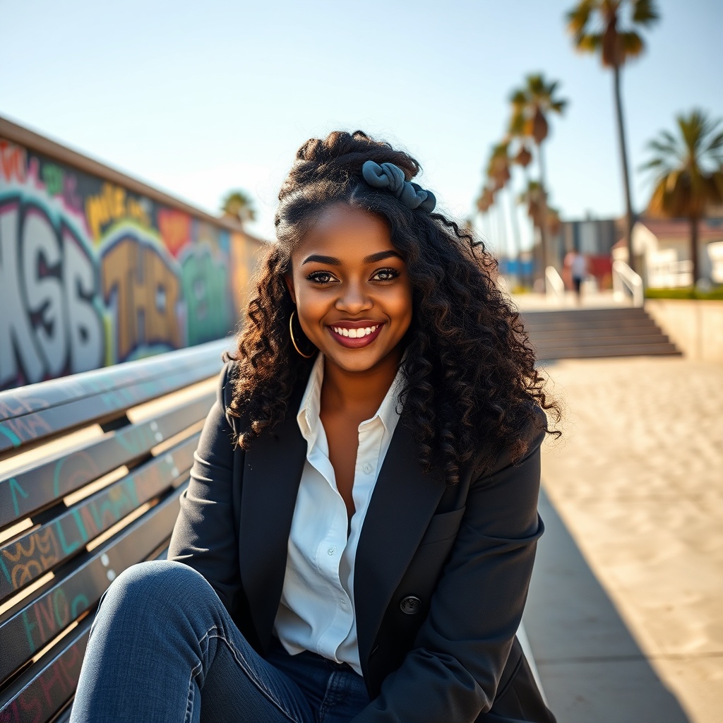Florence Pugh-inspired half-up half-down hairstyle in black hair is perfect for showcasing both elegance and casual appeal. Gather the top section of your hair and secure it with a stylish hair accessory, leaving the rest to flow freely. This look exudes versatility, making it ideal for school or social outings. Opt for a relaxed sitting or leaning pose against a scenic backdrop like a bench or staircase, letting your natural charm shine through. Embrace a casual-chic outfit by pairing high-quality basics such as well-fitted jeans, a white button-down shirt, and a tailored blazer. Add statement accessories or trendy sneakers for a touch of sophistication. Capture the vibrant spirit of Venice Beach with photos featuring colorful graffiti, palm trees, or the sandy beach with an ocean breeze. Taken with a Canon EOS R6 using a 135mm lens at 1/1250s, f/2.8, ISO 400, these ultra high-resolution images should have realistic shadows. The focus is on a smiling subject with curly afro hair, complemented by the sun's glow. The lively atmosphere of unique locations, with a hint of adventure, sets the scene for unforgettable memories.