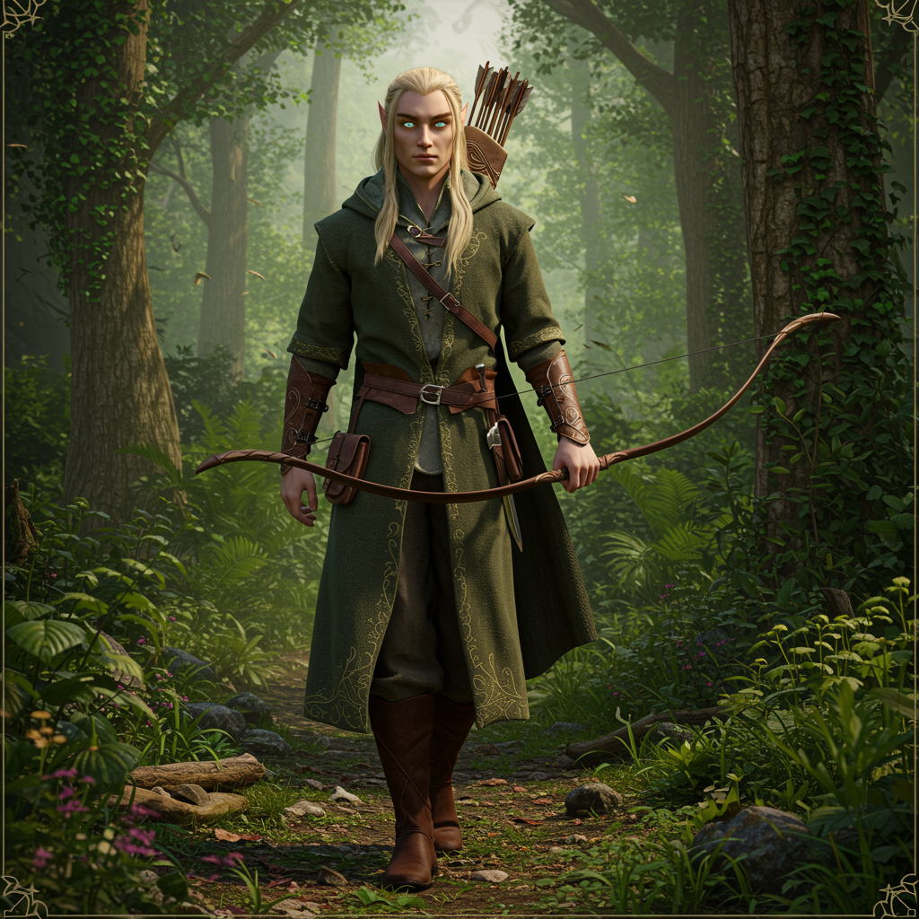 Full body walking pose male elf inspired by Tanis from Dragonlance, an archer amidst a lush forest, exhibiting detailed facial features and captivating eyes. Masterpiece quality in 8k photorealistic detail reminiscent of styles by Jeremy Mann, Sandra Chevrier, and Maciej Kuciara. Sharp realism with authentic shadows, rendered in a 3D environment, subtly altered but maintaining the essence of a noble elven archer harmoniously blending with nature.