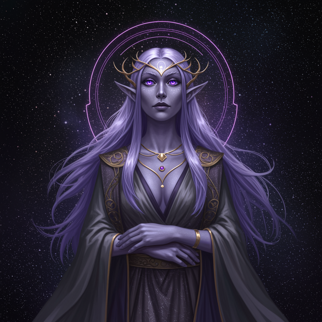 Full body portrait of a celestial deity character, timeless queen, with intricate violet eyes, captured using a Hasselblad H4D 200MS Digital Camera and Mitakon Speedmaster 65mm f/1.4 XCD lens, styled in the aesthetic of Dragon Age, featuring gentle Fresnel lighting, elegant and mysterious aura, ancient robes adorned with ethereal patterns, long flowing hair shimmering like stardust, set against a vast cosmic backdrop, evoking a sense of power and grace.