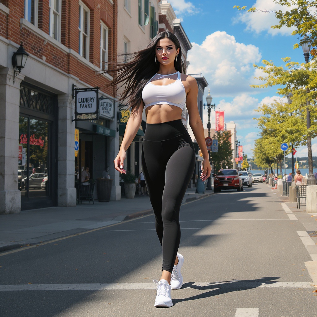 Full body portrait of an elegantly fit woman with flowing long hair, walking confidently through a vibrant downtown. Her detailed, symmetrical face glows with health, and her reflective eyes exude grace and strength. She moves with poise under intricate chiaroscuro lighting and dramatic rim lighting that enhances her toned physique. She wears sleek white sneakers and looks radiant beneath a bright blue sky dotted with fluffy white clouds. Inspired by the styles of John Constable, Ed Blinkey, Atey Ghailan, Jeremy Mann, Greg Manchess, and Antonio Moro, this high-detail, intricately crafted portrait captures a moment of energetic grace, trending on ArtStation and CGSociety. The setting includes hints of a nearby lake, with subtle nods to a cartoonish artistry and a 3D influence, ensuring an engaging and lively image that remains grounded in realism. Soft hues blended with dynamic lighting create a masterpiece free of distortion, cleanly framed without distraction.