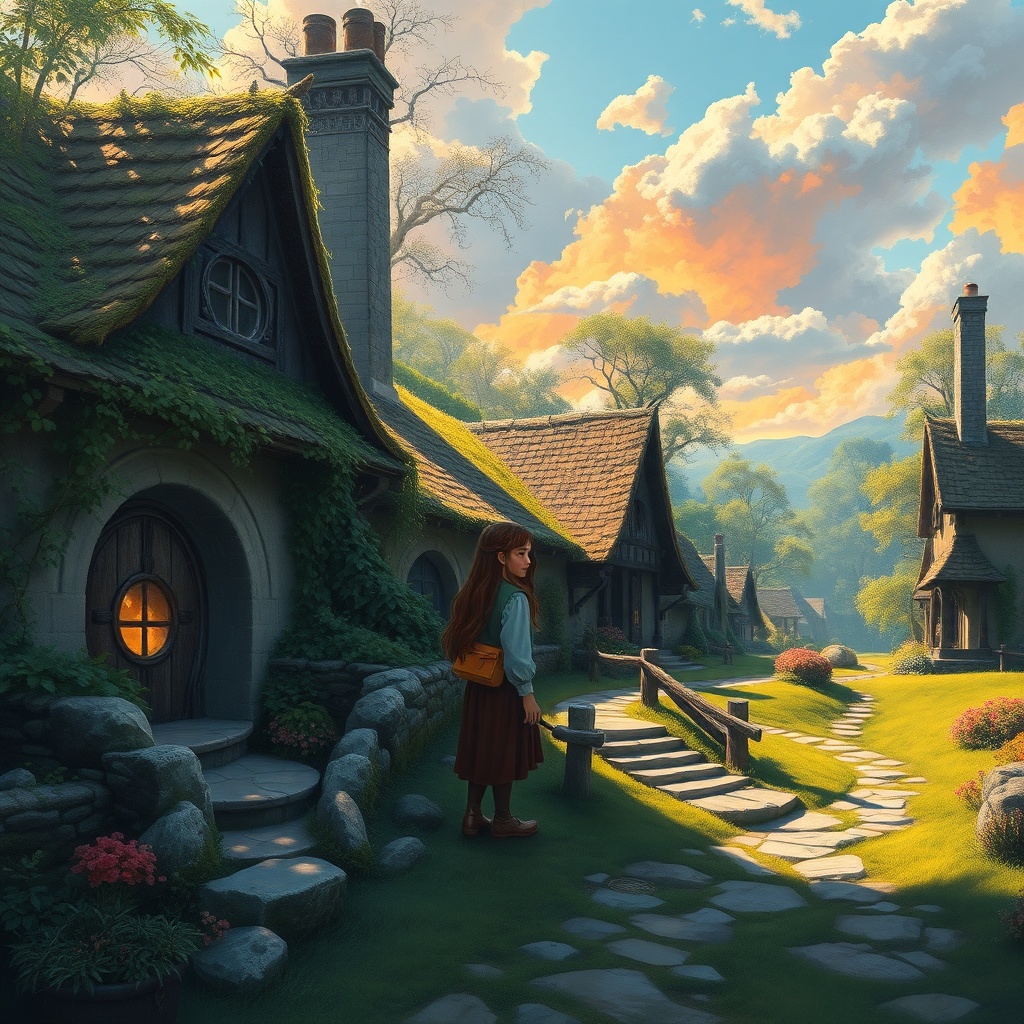 A stunning full-body depiction of the most exquisite artwork ever, set in a tranquil and beautiful hobbit's shire. This majestic oil painting exhibits the exceptional styles of artists like Ed Blinkey, Atey Ghailan, and Jeremy Mann, capturing the charm of Studio Ghibli animations. The artwork skillfully integrates the intricate and high-detail techniques of Greg Manchess and Antonio Moro, creating a photorealistic masterpiece that trends on ArtStation and CGSociety. Rendered in a Style-SylvaMagic, the piece combines both cartoon and 3D elements, highlighting vivid colors and sharp focus. Though maintaining an air of fantasy and surrealism, the scene avoids any unrealistic elements such as extra limbs, poor anatomy, or duplicated features. This professional and awe-inspiring canvas is a testament to the beauty achievable in digital and traditional painting arts.
