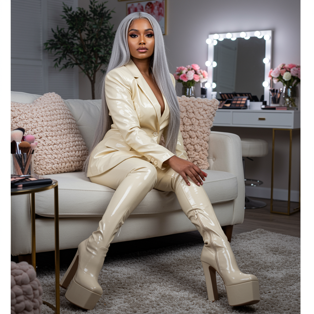 Full-body portrait of a mesmerizingly beautiful Indian fashion model with a long silver ponytail and flawless, radiant brown skin, dressed in a chic, glossy ivory full-body suit and elegant ivory knee-high stiletto platform boots. One side of her face is softly illuminated with a cool-toned azure light, producing a striking and contemporary editorial effect. She poses with grace, stylishly seated on a pristine white couch, surrounded by soft pastels, plush decor, a makeup vanity, and cozy textures. Her hands subtly catch LED-style light, imparting a high-fashion studio glow. Inspired by Taziota's editorial photography, hyperrealistic, with crisp, cinematic lighting.
