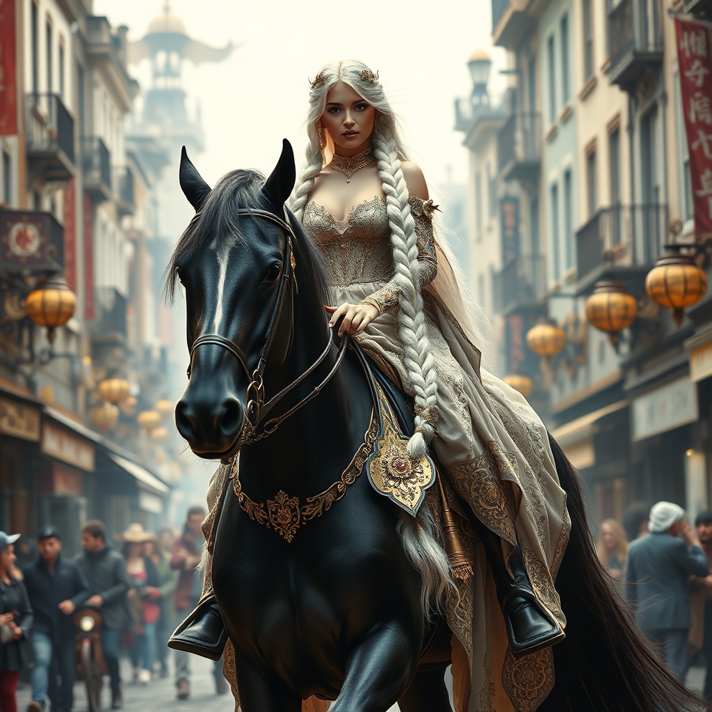 View this AI-generated image featuring a stunning full height portrait of a beautiful lady godiva with a cascading snow white braid adorned in a mini intricately designed dress she gracefully rides a massive black horse through a bustling steampunk street surrounded by intricate highly detailed elem