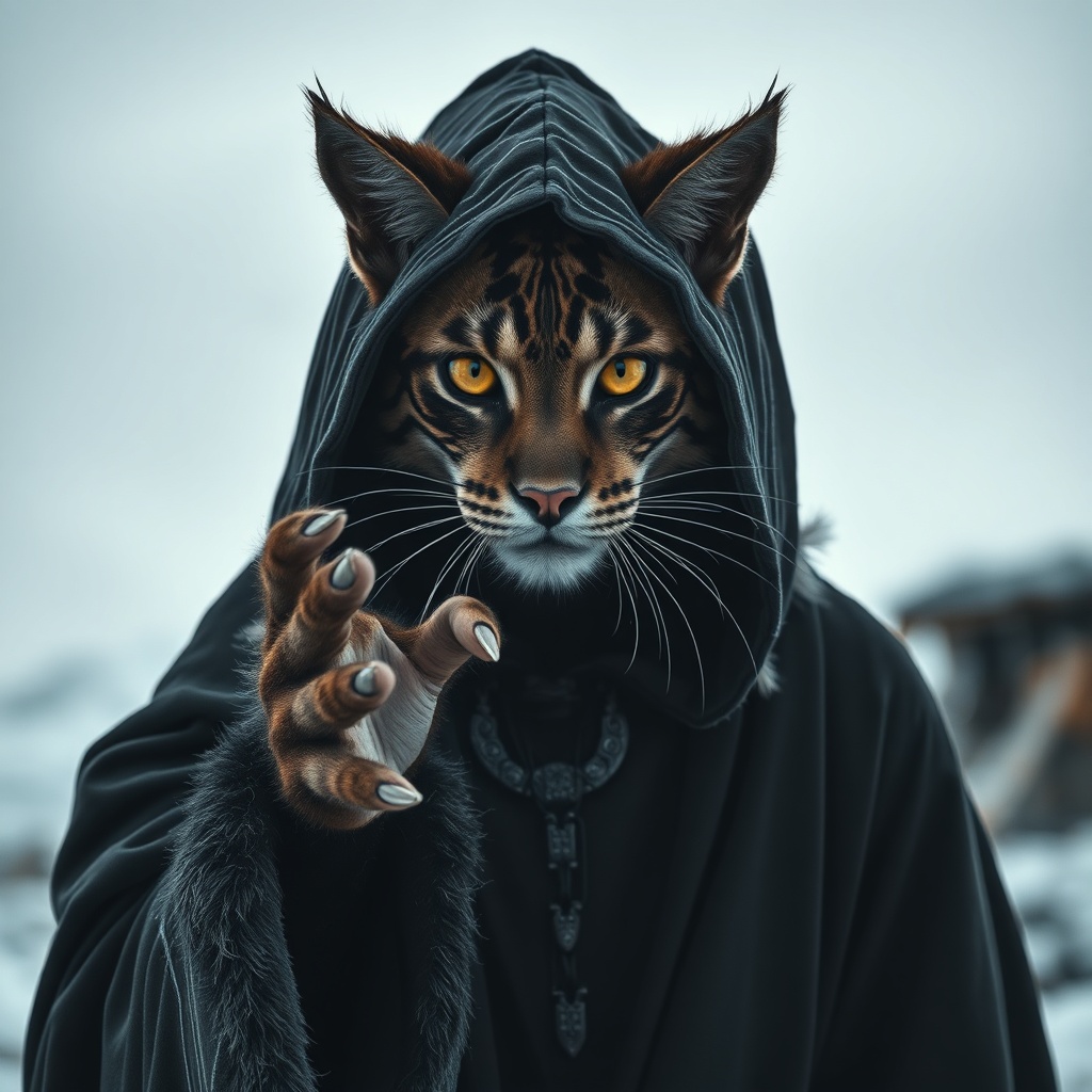 full-length portrait close-up photograph, highly detailed feline facial features, playfully engaging with the camera, head, male humanoid body in flowing obsidian druid robes, outdoors, dramatic cinematic lighting, vibrant highlights, dynamic stance, fur trimmings, intricate and lifelike design with a touch of abstract imperfections, monochrome ambiance with a hint of cold colors, simple background with subtle textures, unique proportions, creatively integrated fingers, hooded appearance with extra ear-like features
