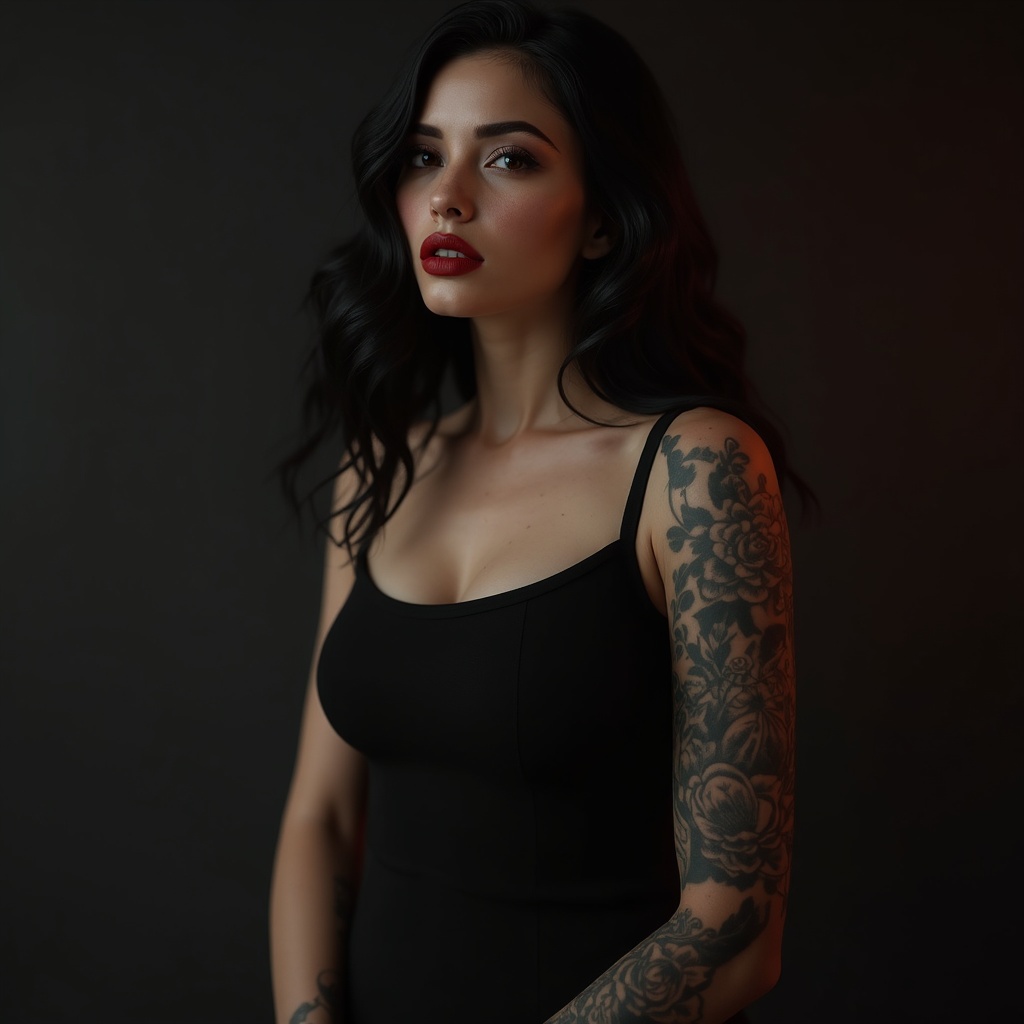Full sleeve tattoo, red lips, wearing a tight all-black sleeveless dress, Canon R5, 200mm lens, sharp focus, shot in RAW format. The image captures an intricate, photorealistic, highly detailed face in 8k HD quality. High-detail RAW color photo, professional quality, ultra high resolution, featuring highly detailed CG unified 8K wallpapers with physics-based rendering, cinematic lighting, and photorealistic mastery. Realism and photorealism with high contrast; meticulously detailed, hyper-realistic skin texture and ultra-high res sharpness. Best quality, raw sharp photo resembling Nikon D850, Kodak Portra 400 film stock with rich colors, lifelike texture, and dramatic lighting. Unreal Engine and trending on ArtStation; Cinestill 800 inspiration. This piece embodies CGI elegance with a hint of digital painting finesse, ensuring a natural yet digitally polished appearance, maintaining artistic integrity while offering a hyper-realistic and visually stunning portrayal.