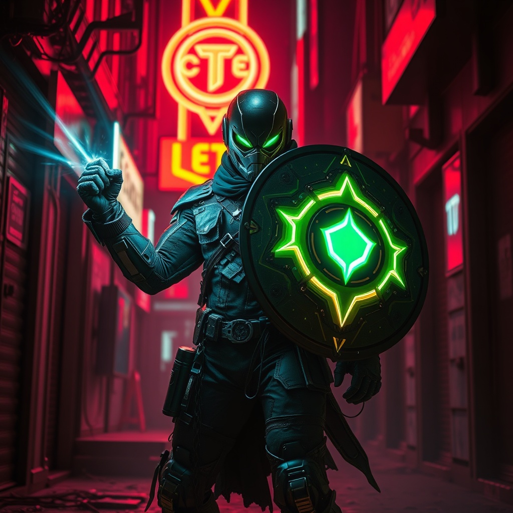 View this AI-generated image featuring in a dystopian future bathed in neon lights and shadowy alleyways a once heroic figure now known as the neon shield reigns with an iron fist clad in a tattered high tech version of his old costume he wields a pulsing energy shield and enhanced cybernetic streng