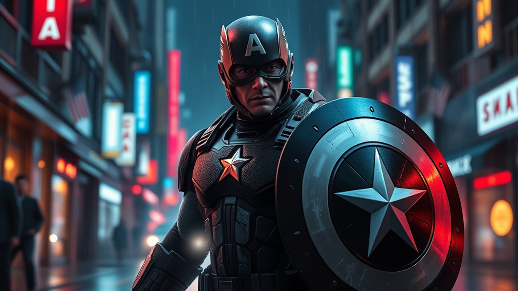 In a dystopian future where neon lights flicker over rain-soaked streets, Captain America emerges not as a symbol of hope, but as a ruthless enforcer of a corrupt regime. Clad in sleek, cyber-enhanced armor with a darkened shield emblazoned with a twisted star, he patrols the chaotic alleys of Night City. Augmented with cutting-edge technology, his superhuman abilities are amplified, making him a formidable force against any who dare challenge his sinister authority. With eyes cold and strategy ruthless, this fallen hero embodies the chilling marriage of patriotism and tyranny, enforcing a twisted order in a world teetering on the brink of chaos.