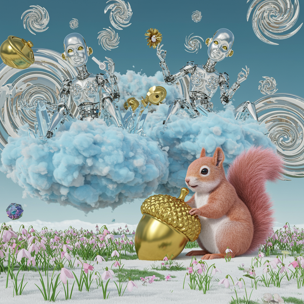 Futuristic art piece inspired by Cyber Bling from the 'Art of Control' collection by Jasper Harvey, featuring a blend of silver and gold hues with intricate facial details and swirling vortexes. Elements include whimsical cyborgs crafted from shimmering crystals, all set atop a fluffy blue cloud where a plump squirrel with soft pink fur gently cradles a giant golden acorn, letting it slip from her paws into a pristine white clearing dotted with delicate pink snowdrops. This vivid scene embodies a raw, fantastical aesthetic in 3D, with an imaginative touch, drawing viewers into a world of futuristic optics and enchanted landscapes.